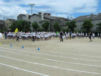 今日、運動会の全校練習がありました。入場行進の練習を、色別にならんで本番のように入場しました。