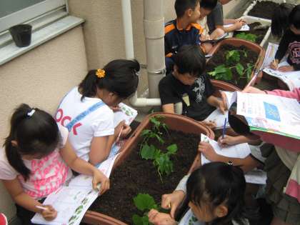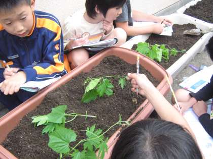 教室で育てていたツルレイシが大きくなり,まきひげも出てきました。大きく育てるためにプランタに植えかえました。後日緑のカーテンにするためネットをはる予定です。