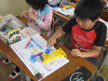 2組は学習の進み具合が少し1組より遅れていますが,かん電池の向きを反対にすると,モーターはどう回るのか実験をしました。子どもたちは,うまく進めていました。