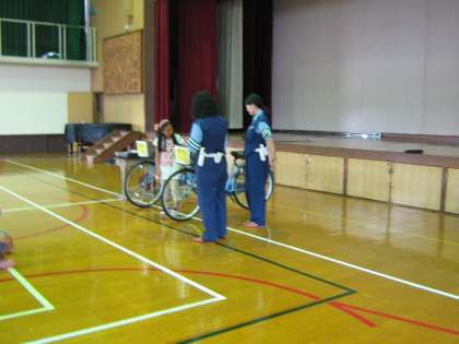本当は,運動場で実際に自転車に乗りながら,いろいろなルールを教わる予定でしたが,あいにくの雨模様でやむなく体育館で行われました。