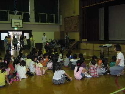 全校で約50名の子どもたちが参加して,ビデオで学習した後,実物の自転車を使ってメンテナンスの講習を受けました。