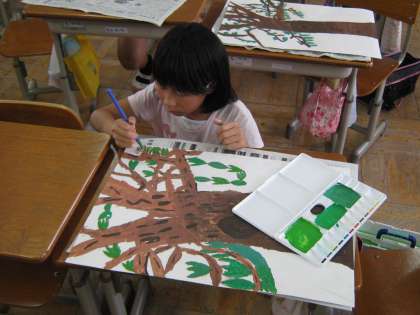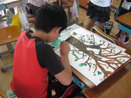 葉の着色が終わりました。次時からはその木で遊んでいる自分や友だちを空想して描きます。