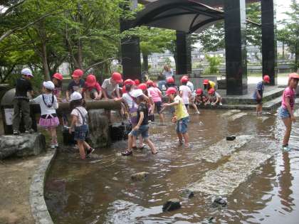 梅小路公園に行きました。1年生と合同で行きました。アクアリーナ前からバスに乗りました。とても暖かい日で川あそびには,最適な日でした。協力し合って楽しい時間を過ごせました。
