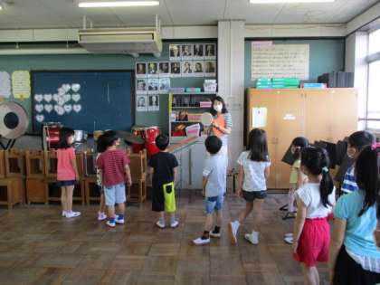 1年生は,昨日はAグループ,今日はBグループが学校探検をしました。臨時休校中にホームページで動画を使って紹介をしていましたが,今回は実際に学校を探検しました。職員室や保健室・給食室・理科室・図工室・音楽室等,様々な教室を見て回りました。1年生は,どの場所でも目を輝かせて見ていました。