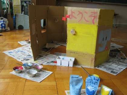 図工クラブでは、段ボールを組み合わせて家や車・家具などを作る計画を立て、