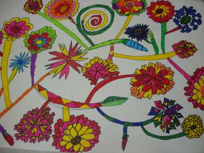 楽しいあったらいいなと思うお花を想像して描いています。線を描くのも,色を塗ることも丁寧にしています。楽しい仕上がりです。