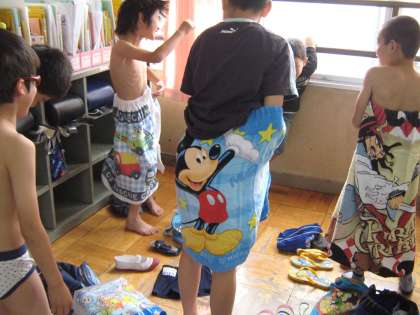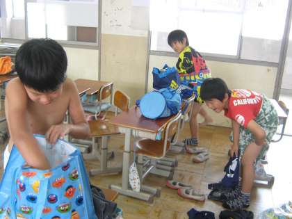 4年生になって最初の水泳学習。何とか雨はやみましたがどんより曇り空。でも,みんなは着替えから楽しそうです。