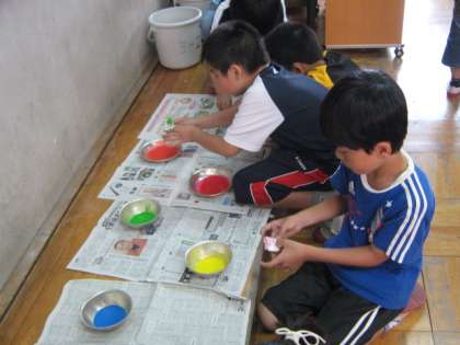 あじさいの絵を描いていくための,染め和紙づくりをしました。