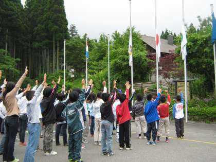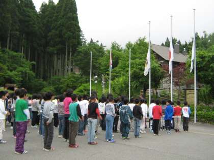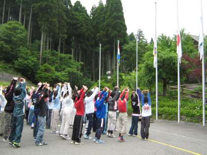 二日目の朝は,宿泊している4校の「合同朝の集い」がありました。