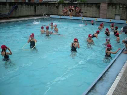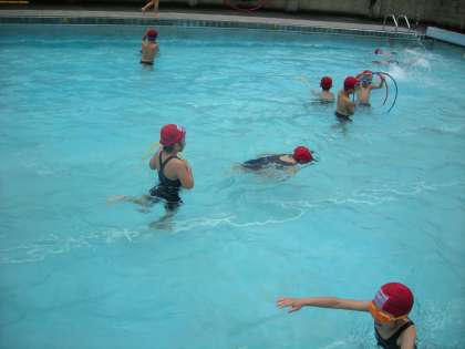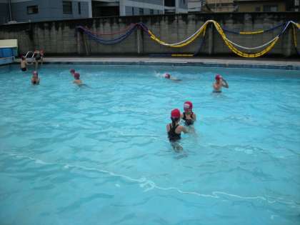 水あそびでは、1時間目は寒いような感じでしたが,終わりのほうは,晴れてきて暑い位でした。二人でバデイを組み,休憩の時は顔色や唇の色を点検し合っています。