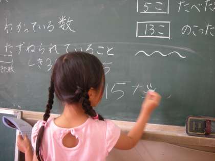 答え合わせは,一人ひとり黒板に書いています。テープ図もかいています。みんなにわかるしっかりした字で書きます。