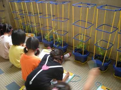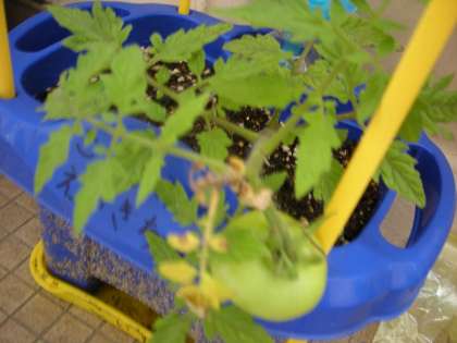 トマトが大きくなりました。大きくなって重みで下向きになっているものばかりになっています。観察するとその後ビニールひもでトマトを持ち上げるようにしました。