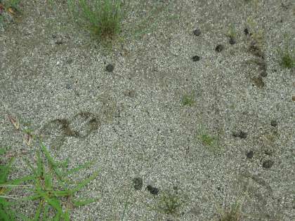交流の森の河原に、シカの足跡とふんがありました。河原に生えている草を食べにきているんですね。