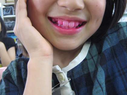 カラーテスターを使い,歯ブラシでうまく磨けていないところの歯のよごれを調べました。赤色がついているところがよごれているところです。そのあと手鏡を見てきれいに磨きました。これからふだん磨きにくいところまで磨いてくれるようになってくれればと思います。