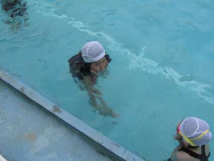 今日は,鼻に水が入らないように息を止めて,水の中で口からブクブクと息をはく練習です。ブクブク・ブクブクと出る泡を目で確かめながら「かにさん歩き」をしたり,頭までもぐって水中を進んだり・・・。