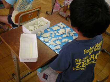 かたぬきかたおしの学習しました。ねんどでかたぬき出来るものを家から持ってきて使いました。