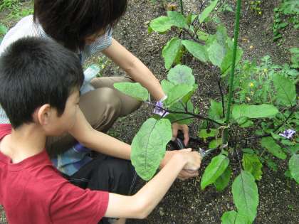 3組の畑のなすが、ずいぶんと大きくなりました。他の野菜ができるのを待つため、一度収穫します。持ってかえって、おいしくいただきます。