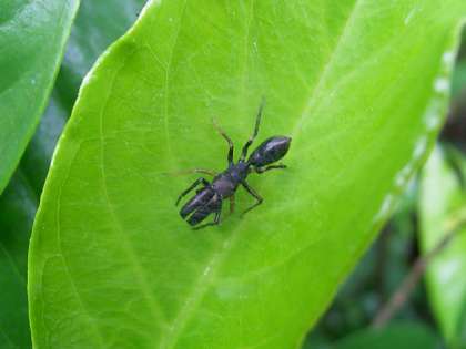 教室の前で、アリグモを見つけました。この個体は、あごが大きくでているのでオスです。オスはあごのために、まだクモだとわかりますが、メスはもうほとんどアリと見分けがつきません。8本ある足の1番目を触角のように前にだしているので、足が6本に見えアリだと思ってしまうのです。アリに見せることでハエなどを油断させ、とらえて食べてしまいます。ハエトリグモのなかまです。