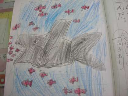 大きなまぐろがきて,スイミーの兄弟たちが食べられた時のスイミーの気持ちを想像話し合いました。その後スイミーの気持ちを想像してスイミーになった気持ちで日記を各自のノートにかきました。