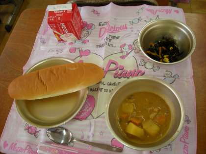 チキンカレーシチューやひじきのソティでした。とってもおいしかったです。みんな暑さの中でのカレーがぴったりでとっても喜んで食べていました。