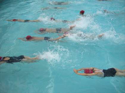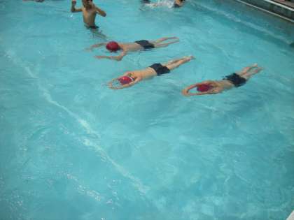 プールの短い辺の12メートルの距離を向こう岸まで立たないで息つぎありで行くことをしました。1組2組ともに15名位の子どもは,泳ぎきることが出来ました。