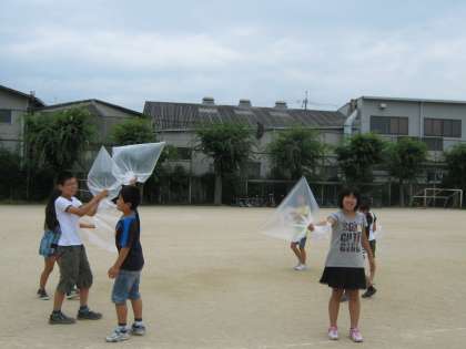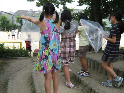 はじめは,大きなナイロン袋いっぱいに空気を閉じ込めるのですが,なかなかつかめきれずに,袋を膨らませては逃してしまう繰り返しです。