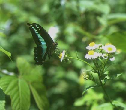 プールの近くで、アオスジアゲハを見つけました。ものすごく早く飛ぶので、飛んでいるときは撮影できず、蜜を吸っているときか、水を飲んでいるときかしかチャンスがありません。青い筋がとても鮮やかなアゲハチョウの仲間です。