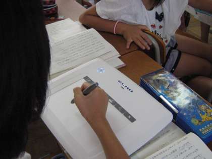 ワイヤレスペンタブレットを使うと,離れたところからでも書き込めます。子どもたちも大事なところにしるしをつけるなど上手に使っています。