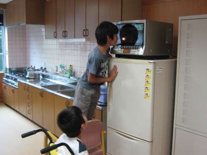 今日、3組でピザを焼きました。今、オーブンで焼いています。もう、やけたかな?