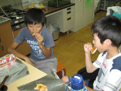 とうとう焼けました。いよいよ食べま〜す。おいし〜い。自分たちで作ったものは最高に、おいしいですね。