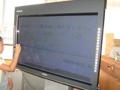 夏休み前最後の単元「小数」の学習をしています。今日は小数のしくみについてみんなで考えました。写真は小数の順序を電子黒板で確認しているところです。