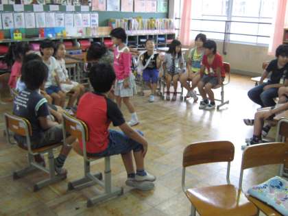 台風の影響で朝から雨です。今日は運動場で遊べません。遊び係がみんなに呼びかけて,フルーツバスケットをすることになりました。雨ですが楽しい中間休みになりました。