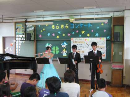 7月19日(火)に、山ノ内小学校で「きらきらコンサート」がありました。右南支部10校が集まって演奏を聴いたり、合奏したりしました。フォークローバーの人たちが来てくださって、素敵な演奏を聴かせてくださいました。