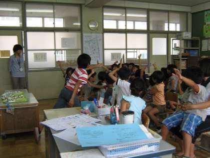 2年1組との交流のあと、2年2組とも交流しました。2組のみんなもとてもよろこんでくれて、お礼にマルモリダンスをひろうしてくれました。