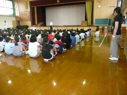夏休み前の朝会です。みんな楽しい夏休みになるように気をつけることのお話を聞きました。