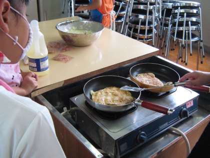 ひっくり返すのにとてもドキドキしましたが,どの班もおいしいお好み焼きができました。