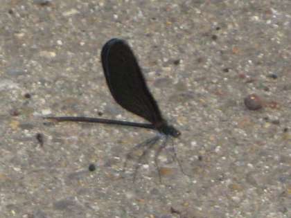 今日、観察池のまわりでハグロトンボのメスを見つけました。オスの方は、昨年ホームページで紹介しました。オスの方は、体が金色と緑色が混じったようなキラキラした色で、メスは真っ黒です。ハグロトンボは、イトトンボの仲間です。