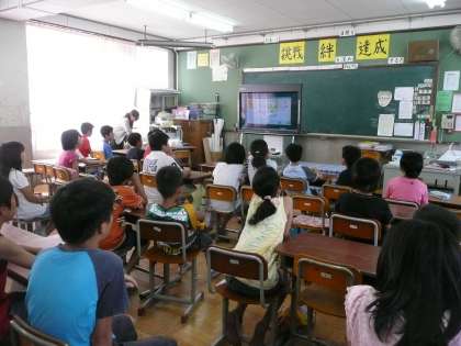 コンピュータ室で,新聞づくりをしました。その作り方を電子黒板で教えてもらっています。