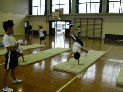 今日から体育ではマット運動がはじまりました。今日のねらいは,自分のできる技を連続で行うことと,自分のできる技を組み合わせて連続で行うことです。