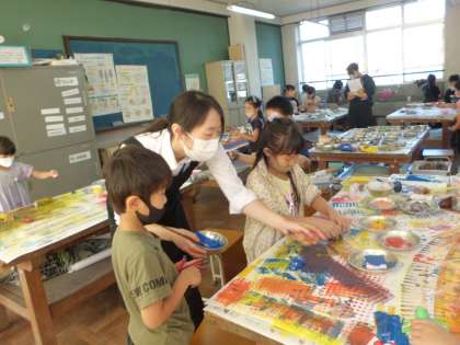 キャップに絵の具を付けて,紙にポンと写して見せると「うわあ。丸がでてきたあ。」「すごい。」「やりたい。」「かわいい。」と歓声を上げる子供たち。やりたい気持ちをいっぱいに膨らませ授業が始まりました。活動が始まると,自分で持ってきた材料や用意された材料からいろいろな形が生みだされ,大きな模造紙があっという間に形と色でいっぱいになりました。