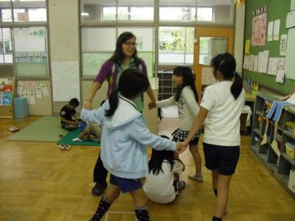 3組に遊びに来たお友達が、ジェニー先生と、かごめ かごめをして遊んでいました。とても楽しそうでした。