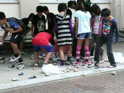 アルミ缶集めの日の様子です。今年度に換金したお金を,東北の地震の被害を受けた人たちに募金しました。