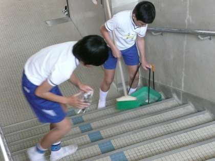 階段をほうきで掃いた後は,ぞうきんでふいています。