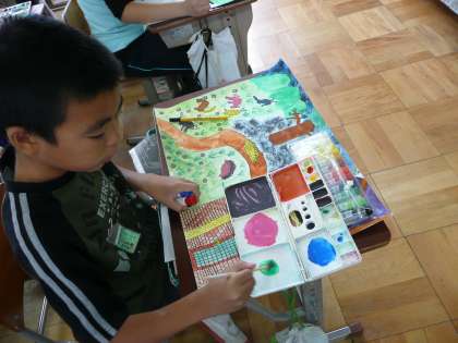 「真夜中の子ねこ」というお話を聞いて,自分の描きたい場面を想像して描いています。色の塗り方を工夫したり,色の作り方を考えたり・・・筆の使い方を工夫して仕上げていきます。
