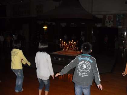夜はキャンドルファイアーです。室内でのキャンプファイアーです。ゲームや歌で楽しい時間となりました。