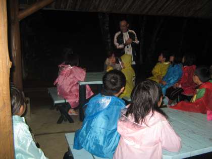 2日目最後はきもだめしです。写真はスタートする前に少し怖い話をしているところです。みんなかなりこわがっていました。