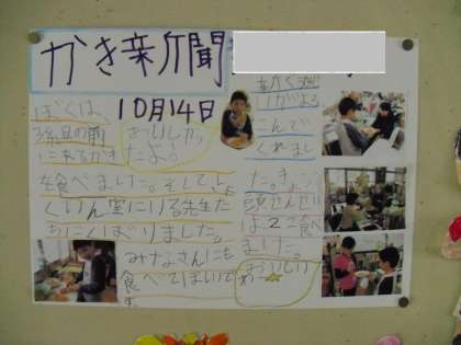できたてホヤホヤの「かき新聞」を壁に貼りました。