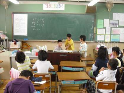 給食時間に,クイズ係が活躍してくれています。この日は,いつもとは違いコントに挑戦しました。自分たちで考えて,みんなを笑わそうと頑張っていました。