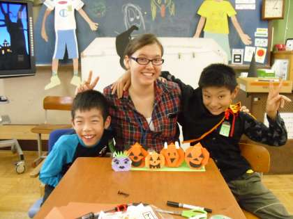 とてもかわいいジャック・オー・ランタンが完成しました。記念にみんなで、記念撮影をしました。いい記念になりました。