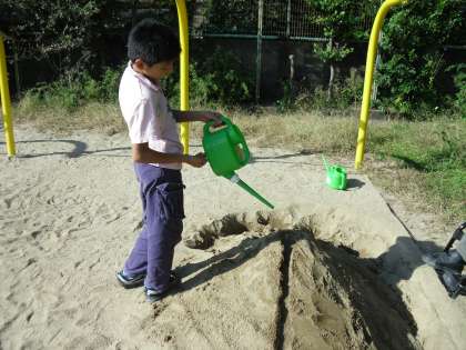 理科の学習で、流れる水に取り組んでいます。水の量を変えて実験したりしています。